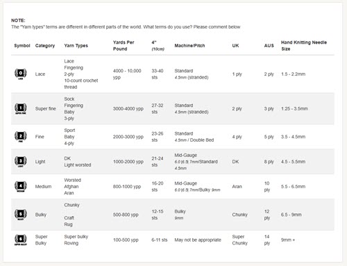 Symbol | Category | Yarn Types | Yards Per Pound | 4" (10cm) | Machine/Pitch | UK | AUS | Hand Knitting Needle Size |